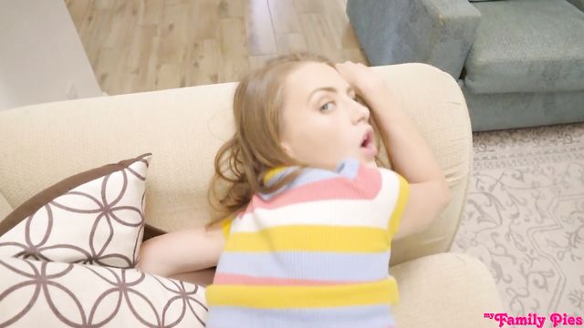 Description:Kyler Quinn and her stepbrother Damon Dice are super into each other, but they have to hide their relationship from their parents. They make out in the living room knowing that Damon's dad, Chris Valiant, will be home any minute. Fortunately, they pull away from their make out session just in time as Chris walks through the door! Greeting the kids, Chris takes off to go get comfortable. That gives Kyler the chance to pull Damon's stiffie out of his pants to deliver a handie that once again nearly gets them caught. They hear Chris coming and pull a blanket over themselves in the nick of time.