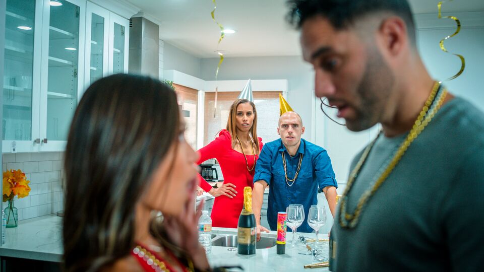 Description:Kylie Le Beau and Dan Ferrari got married recently, which makes Damon Dice and Vina Sky step cousins. They've always been close, but now they're practically family. When you add Vina's friend, Jewelz Blu, to the mix, the chemistry between all three of them is explosive. As the new year approaches, Kylie and Dan encourage a midnight kiss but they warn that Damon and Vina shouldn't participate together. Jewelz has other ideas. She urges the stepcousins to smooch at midnight, which goes great until Dan pulls Damon aside and reads him the riot act. The girls decide to make it up to Damon later.As Dan and Kylie settle in to watch a movie, Vina and Jewelz sneak in to make things better for poor Damon. Opening wide, they start sucking his cock together as he tries to keep his cool for his parents. Jewelz watches as Vina gets creative with her beads. Jewelz tries it on for size, too, before coaxing Vina into taking it to the next level. She urges Vina to hike up her miniskirt and hop onto Damon's hardon. Leaning forward, Vina rides her cousin as she keeps those puffy lips shut to try to hold the moan. Meanwhile, Jewelz strips down so that she can take Damon's ding dong for a spin when Vina climbs off it.Damon can't get enough, especially once he's had the chance to sample Jewelz's lovely big titties as she rides him. He dips back into Vina's snatch as Jewelz cradles her right there on the table behind the couch. The girls make out as Damon fucks Jewelz in doggy, but Jewelz is eager to explore her friend's dripping cooch, too. She rolls onto her back so Damon can keep her party going as Vina climbs up to ride her face. As the near year approaches, Vina reaches her final muffled climax. She gets off of Jewelz and onto the floor, her mouth open to catch the dripping creampie that Damon has deposited into her friend's greedy twat.