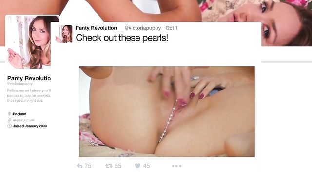 Description:Sexy blonde Cherry Kiss looks stunning in stockings and high heels as she checks out Victoria Puppy’s panty blog. She spreads her thighs to reveal her pussy, framed by open-crotch panties, and undresses as she watches the fun on her laptop. Pulling her panties tight to squeeze her plump pussy, she rubs her clit and sinks her fingers into her juicy slit. She smiles naughtily as she licks and sucks a big black dildo, and pushes it deep inside herself, gasping as it fills her. The irresistible beauty crouches to ride her sex toy harder, then lies back and masturbates to an intense orgasm.