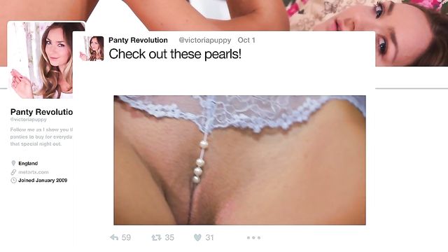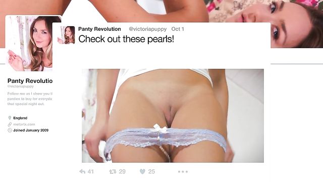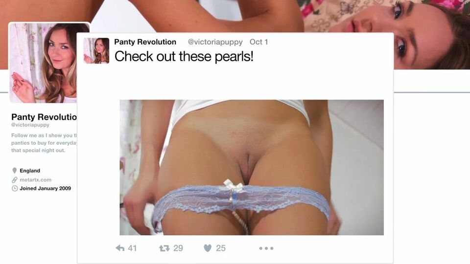 Descripción: Sexy blonde Cherry Kiss looks stunning in stockings and high heels as she checks out Victoria Puppy’s panty blog. She spreads her thighs to reveal her pussy, framed by open-crotch panties, and undresses as she watches the fun on her laptop. Pulling her panties tight to squeeze her plump pussy, she rubs her clit and sinks her fingers into her juicy slit. She smiles naughtily as she licks and sucks a big black dildo, and pushes it deep inside herself, gasping as it fills her. The irresistible beauty crouches to ride her sex toy harder, then lies back and masturbates to an intense orgasm.