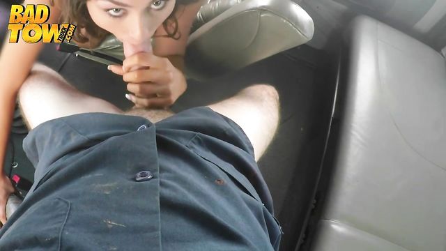 Description:The day started off on a bad note when I was about to tow a classic car and this guy came running at me. He was one big bad looking mofo but luckily I was able to jump in the truck and drive away before he could get a hold of me. Later on I got a call from a girl stranded on the side of the road. After checking it out I told her it would be $300 cash to tow it back to her house. She said her boyfriend didn't know that she took the car and she didn't want him asking questions. Next thing I know this hottie was offering up a blowjob and we were on our way. I had my fat cock in her mouth in no time and even got to see some tits and ass in the process. This job is turning out to be a real winner!