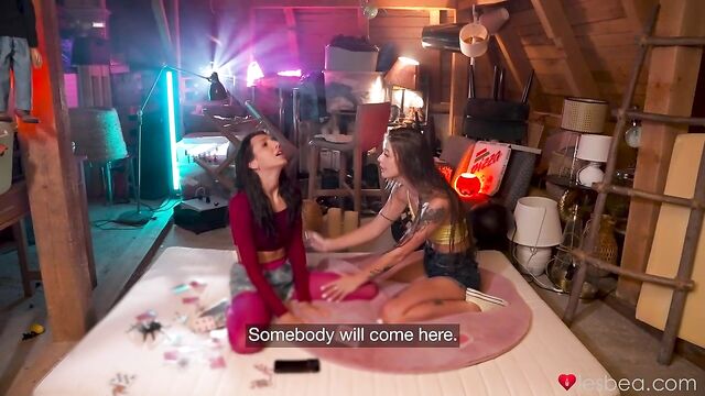 Description:With a storm raging outside, sexy Euro babes Mini Mitzix and Olivia Sparkle sneak inside someone's basement to take shelter. The beautiful lesbians warm up by taking off their wet clothes, exposing their small, natural boobs, and it isn't long until they are passionately making out with each other! Ripping apart Mini’s pink tights, Olivia leans over to eat out the raven-haired nymph’s pussy, and then it’s Mini’s turn to pull down Olivia’s booty shorts and slide aside her thong so that she can pleasure the hot brunette from behind in doggy position. Afterwards, the petite Czech sits on Olivia’s pretty face for a tongue fucking, and then Olivia spreads her slender legs, inviting Mini to taste her sweet juices. To finish, the amorous couple do some scissoring on the floor until they both reach an explosive orgasm!